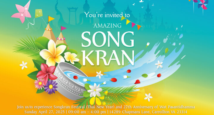 The Thai community of the greater Hampton road area will hold its 2029 SONGKRAN FESTIVAL AND 26th ANNIVERSARY OF WAT PA on Sunday, April 26, at Wat Pasantidhamma, 14289 Chapman’s Lane Carrollton, VA. 23314. There will be many different kinds of Thai food and souvenirs stands. There will be free samples of traditional Thai Foods and performance of the sand pagoda dedicated to Buddha on Songkran Day Wat. Admission is FREE.